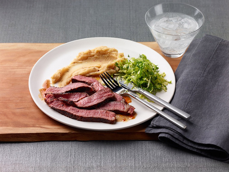 Chef George Pagonis Grilled Australian ribeye with skordalia, brussels sprouts, harissa vinaigrette